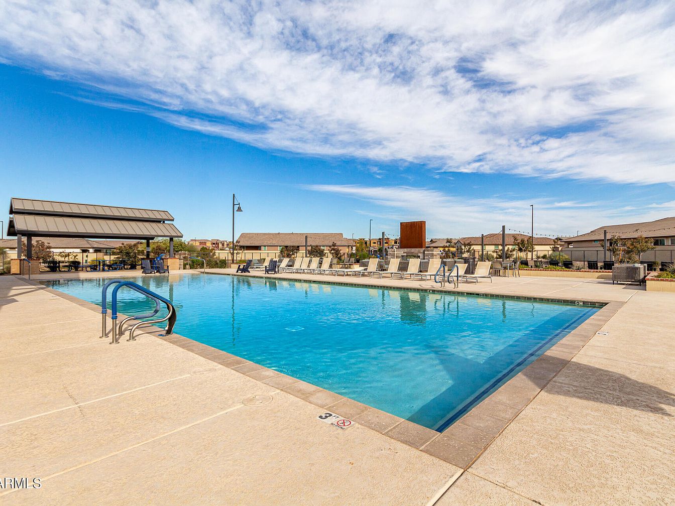 This outdoor community pool area features a spacious rectangular swimming pool with crystal-clear blue water, edged by neutral-toned concrete decking and a subtle taupe border. Comfortable beige lounge chairs line one side, providing ample seating for relaxation under the sun. A covered pavilion with a metal roof offers shaded seating and picnic tables, ideal for social gatherings. Surrounding low-maintenance landscaping and modern lampposts complement the open, airy design. The clear sky and distant residential rooftops add to the inviting, serene atmosphere of this well-maintained communal recreational space.
