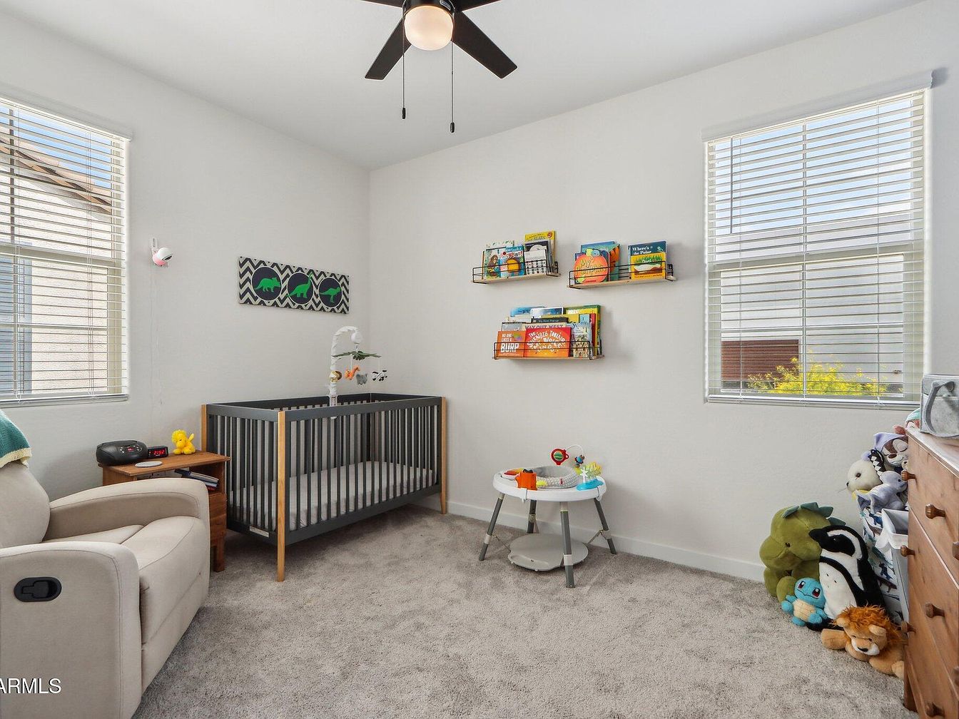 Bright and cozy nursery space with soft gray carpeting and white walls, creating a calm and inviting atmosphere. A modern crib with black slats and wooden legs sits against one wall, complemented by a mobile overhead for visual stimulation. Adjacent is a plush beige reclining chair perfect for feeding or soothing. Natural light streams through two large windows with white blinds, enhancing the airy feel. Three wall-mounted wire shelves display colorful children’s books for easy access. The corner features a collection of plush toys, adding warmth and personality to this well-organized, functional room.