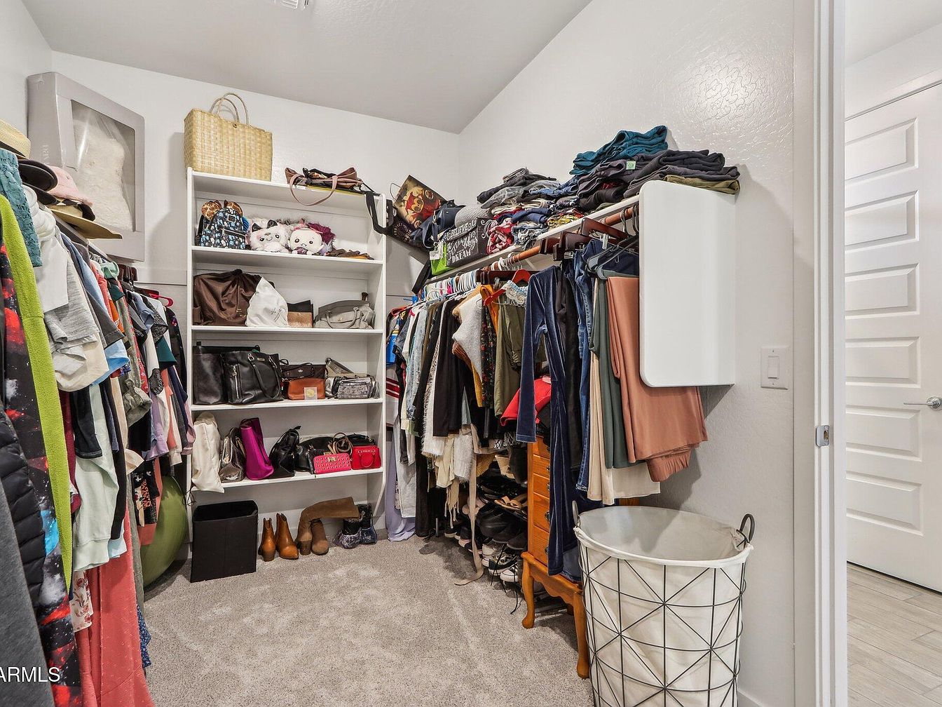 This well-organized walk-in closet features clean white walls and neutral-toned carpeting that create a soft, inviting atmosphere. On the left, a rack holds various hanging clothes, while a tall white shelving unit in the center displays an assortment of bags and accessories in an orderly fashion. The right side reveals a long wooden dresser topped with more folded clothes and an additional clothing rod with garments hung neatly on hangers. The closet includes functional elements such as a laundry basket by the door and an electrical panel on the wall, balancing style and practicality effortlessly.