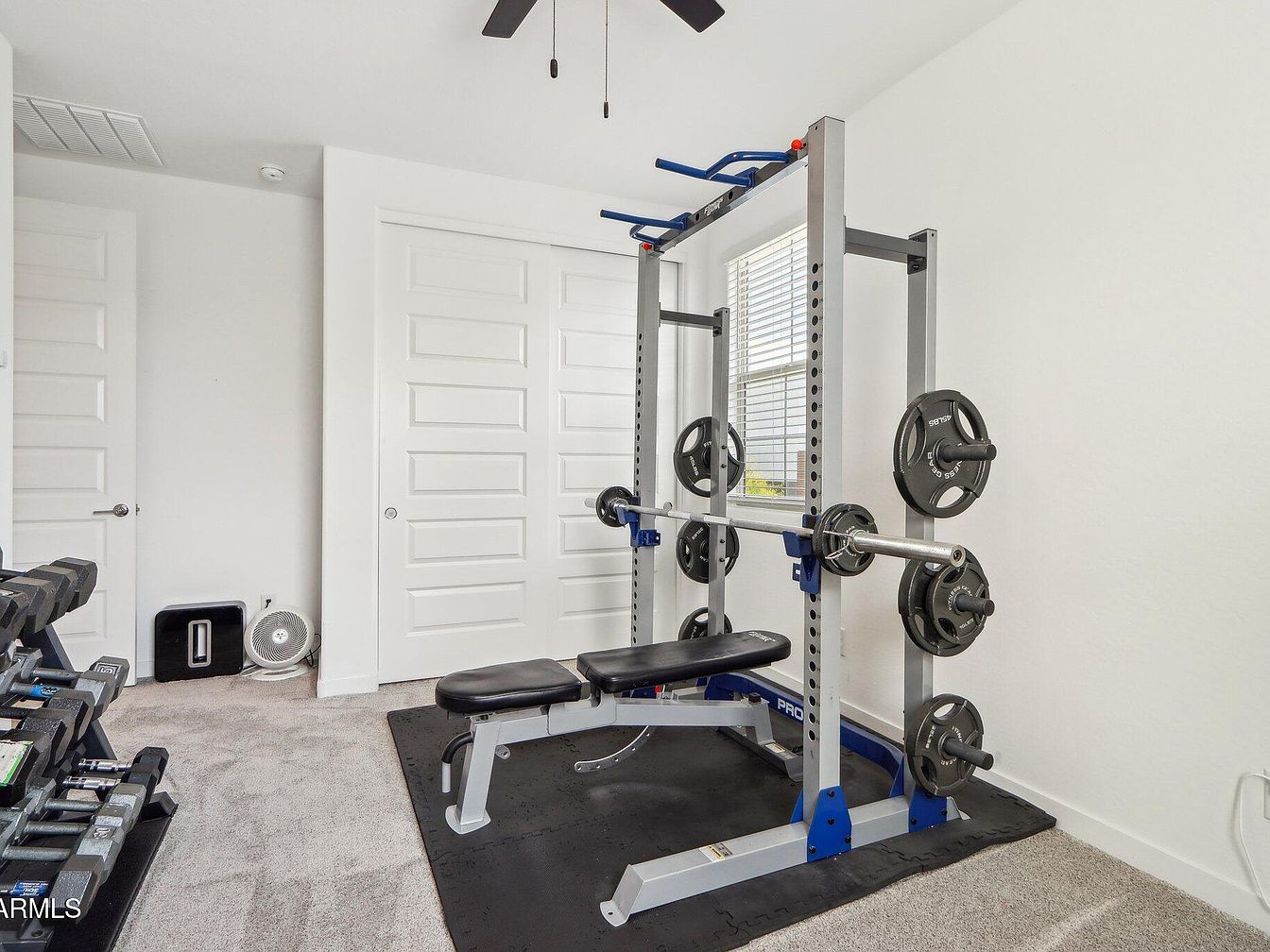 This compact home gym area features a versatile weightlifting rack and adjustable bench, positioned on a protective black rubber mat to safeguard the beige carpet underneath. The walls and doors are painted a crisp white, enhancing the room’s clean, minimalist vibe. Natural light filters in through a window with white blinds, brightening the space. A set of dumbbells neatly lines the left side, while a small fan and an electronic device sit unobtrusively by the wall, emphasizing the room’s practical, efficient design geared toward focused workouts.