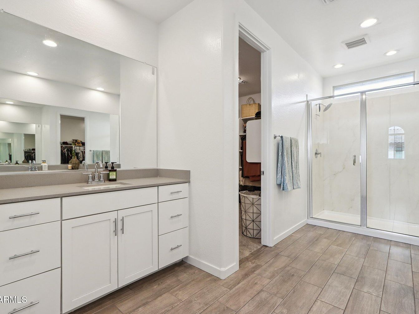 This master bathroom emphasizes a clean, modern aesthetic with white walls and cabinetry paired with a light gray countertop. The vanity features a wide, frameless mirror with built-in lighting above, creating a bright and spacious feel. To the right, a glass-enclosed shower with polished chrome fixtures and a marble-patterned surround adds an elegant touch. The space leads directly to a walk-in closet, adding convenience. The wood-look tile flooring introduces warmth and texture, balancing the crisp white finishes. Accents like a patterned blue towel add subtle color contrast to the neutral palette.