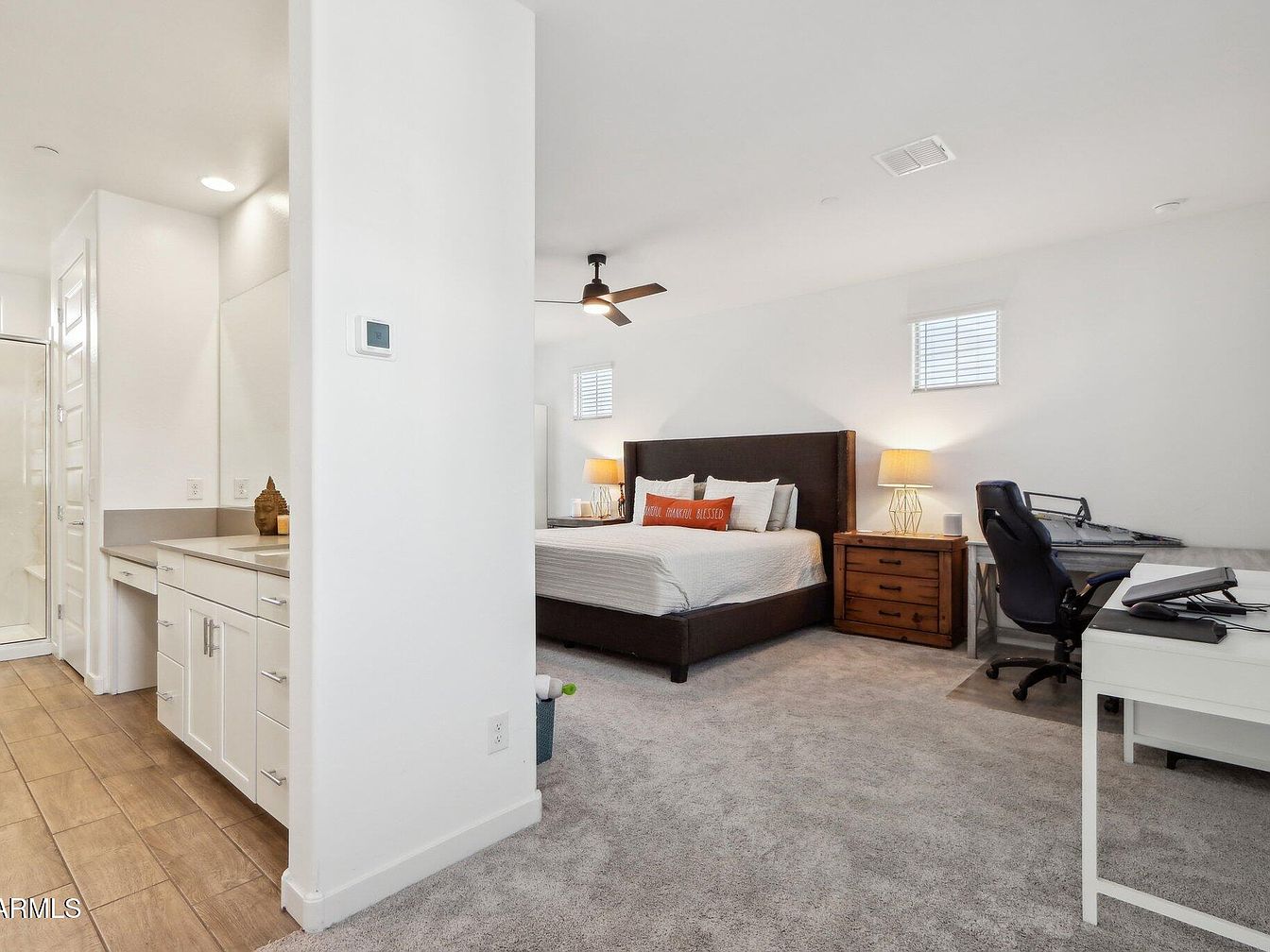 This master bedroom features a spacious layout with plush light gray carpeting extending throughout the room. The walls are painted bright white, enhancing natural light from two small rectangular windows. The bed has a dark upholstered frame with a padded headboard, contrasted by crisp white bedding and a decorative burnt orange lumbar pillow. On one side, a warm wooden nightstand with a modern geometric lamp adds a touch of rustic elegance. Adjacent to the sleeping area is a minimalist white desk paired with an ergonomic black office chair, creating a practical workspace. The vanity and bathroom area display white cabinetry with sleek silver handles, topped with neutral countertops and a large mirror, complimented by wood-look tile flooring, blending functionality with clean, contemporary design.