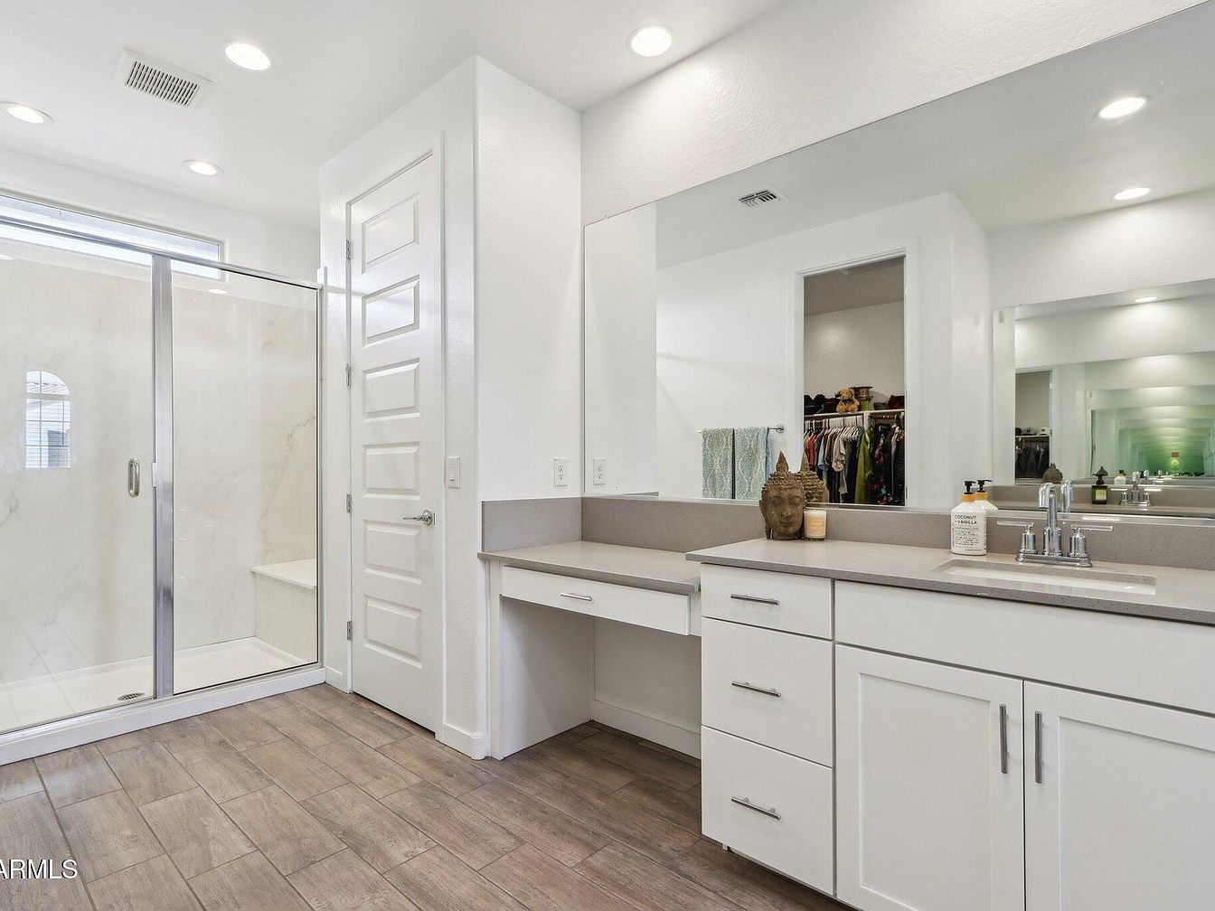 This spacious master bathroom features a large, modern vanity area with a sleek, light gray countertop extending seamlessly into a built-in makeup desk. White cabinets with clean, simple hardware provide ample storage beneath. A large mirror spans the wall behind the sink and desk, enhancing the sense of openness and reflecting the soft recessed lighting above. The flooring consists of wood-look tiles that add warmth and texture to the predominantly white and neutral-toned room. To the left, a glass-enclosed shower with marble-like walls complements the fresh, contemporary style of the space.