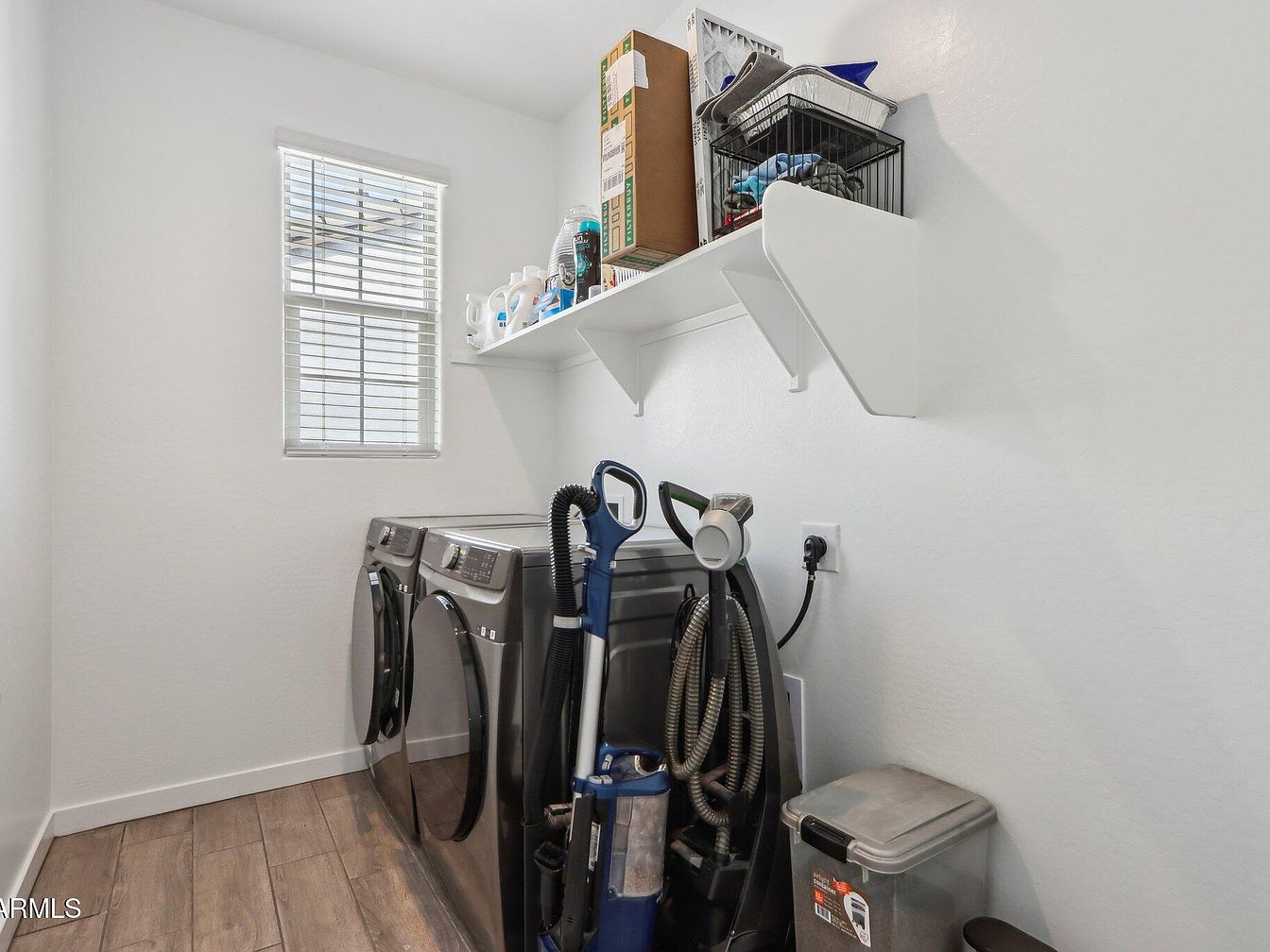 This compact laundry room offers modern efficiency with sleek front-loading washer and dryer units in stainless steel finish. The walls are painted bright white, amplifying natural light that streams through a small window with white blinds, balancing privacy and illumination. Above the appliances, a sturdy white shelf is mounted for easy-access storage, holding cleaning supplies and household items. The room’s flooring mimics wood, adding warmth to the otherwise minimalist design. Vacuum cleaners and a trash bin are neatly positioned beside the machines, emphasizing functionality and thoughtful organization within a small but well-utilized space.