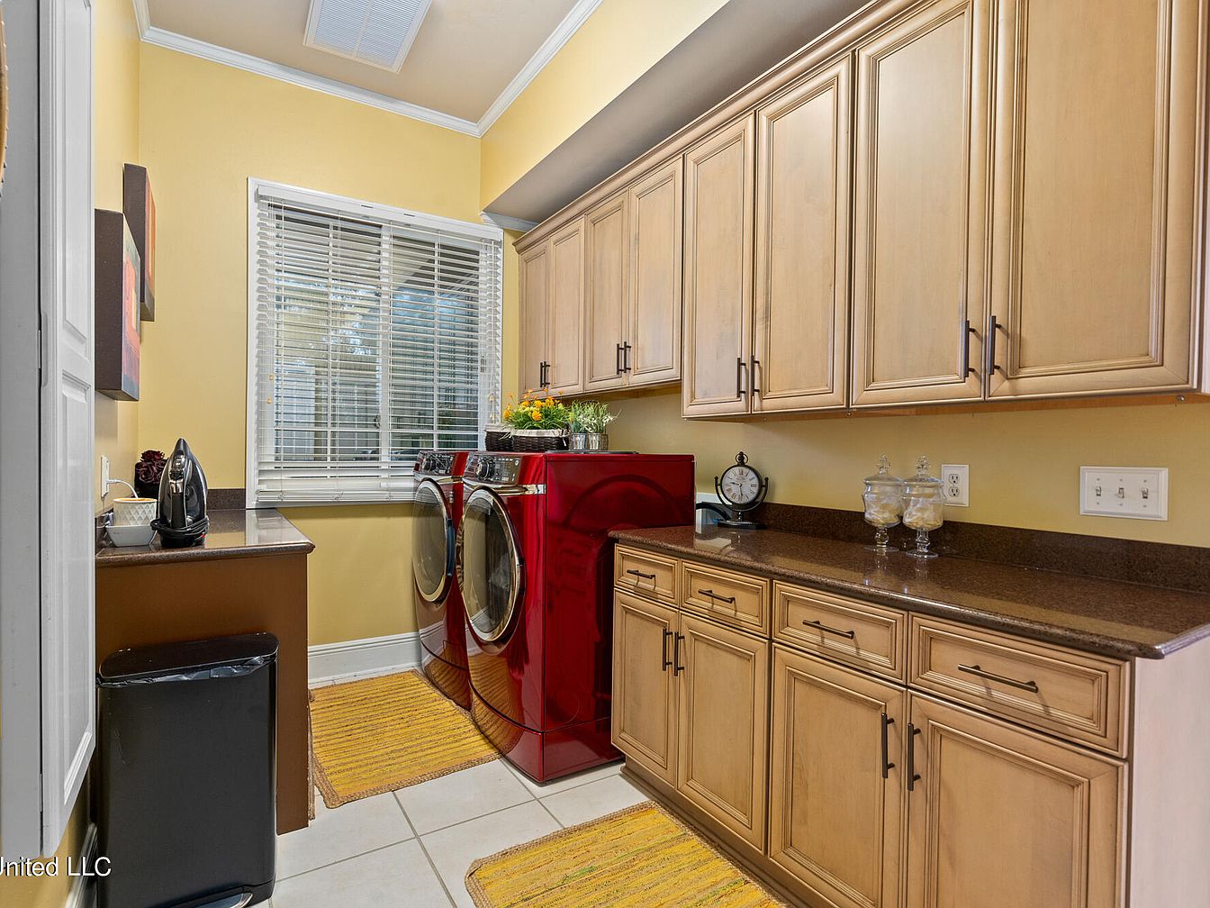 This laundry room features a warm and inviting color palette with sunny yellow walls contrasting against dark granite countertops. A pair of striking red front-loading washer and dryer units stand side by side, adding a vibrant pop of color. Above and below the counter, light wood cabinetry with black handles provides ample storage space, while two yellow striped rugs complement the wall color and bring warmth to the tile flooring. A large window with white blinds lets in natural light, enhancing the cheerful atmosphere. Decorative touches like a clock, potted plants, and glass jars add personality and functionality to the clean, organized space.