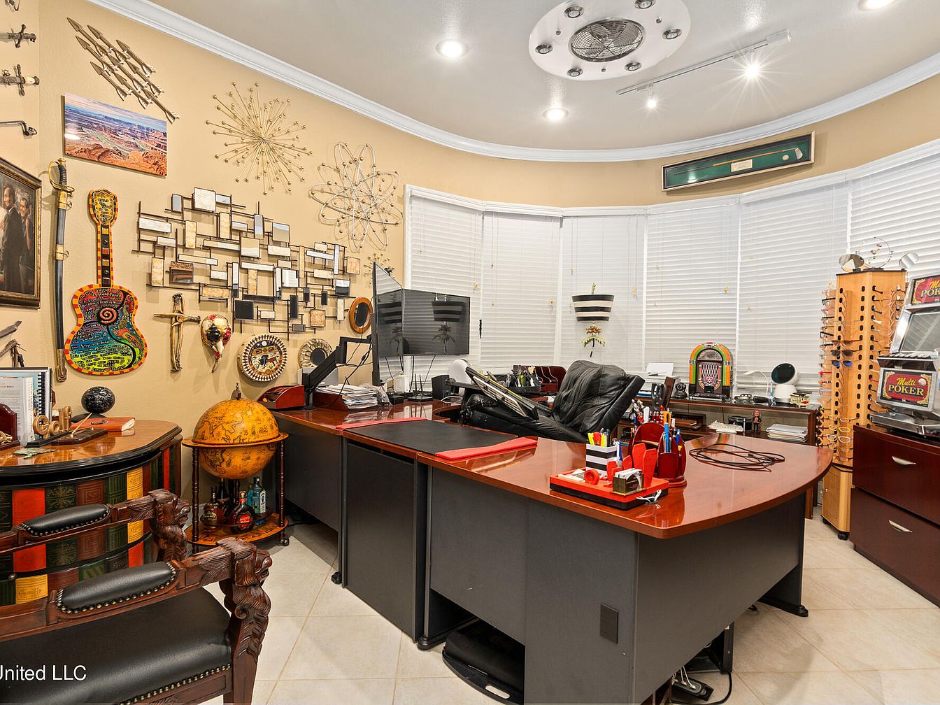 This spacious home office features a distinctive curved layout with a large wooden executive desk set against a bay window fitted with white blinds, allowing for ample natural light control. The room’s warm beige walls serve as a gallery for eclectic art and decorative pieces, including a colorful guitar wall hanging, a world globe barcart, and intriguing metallic wall sculptures. Comfortable traditional-style leather chairs with ornate wooden detailing complement the workspace. Functional elements such as dual computer monitors and organized office supplies emphasize productivity, while vintage-themed items like a jukebox and classic décor add personality and charm to the environment.