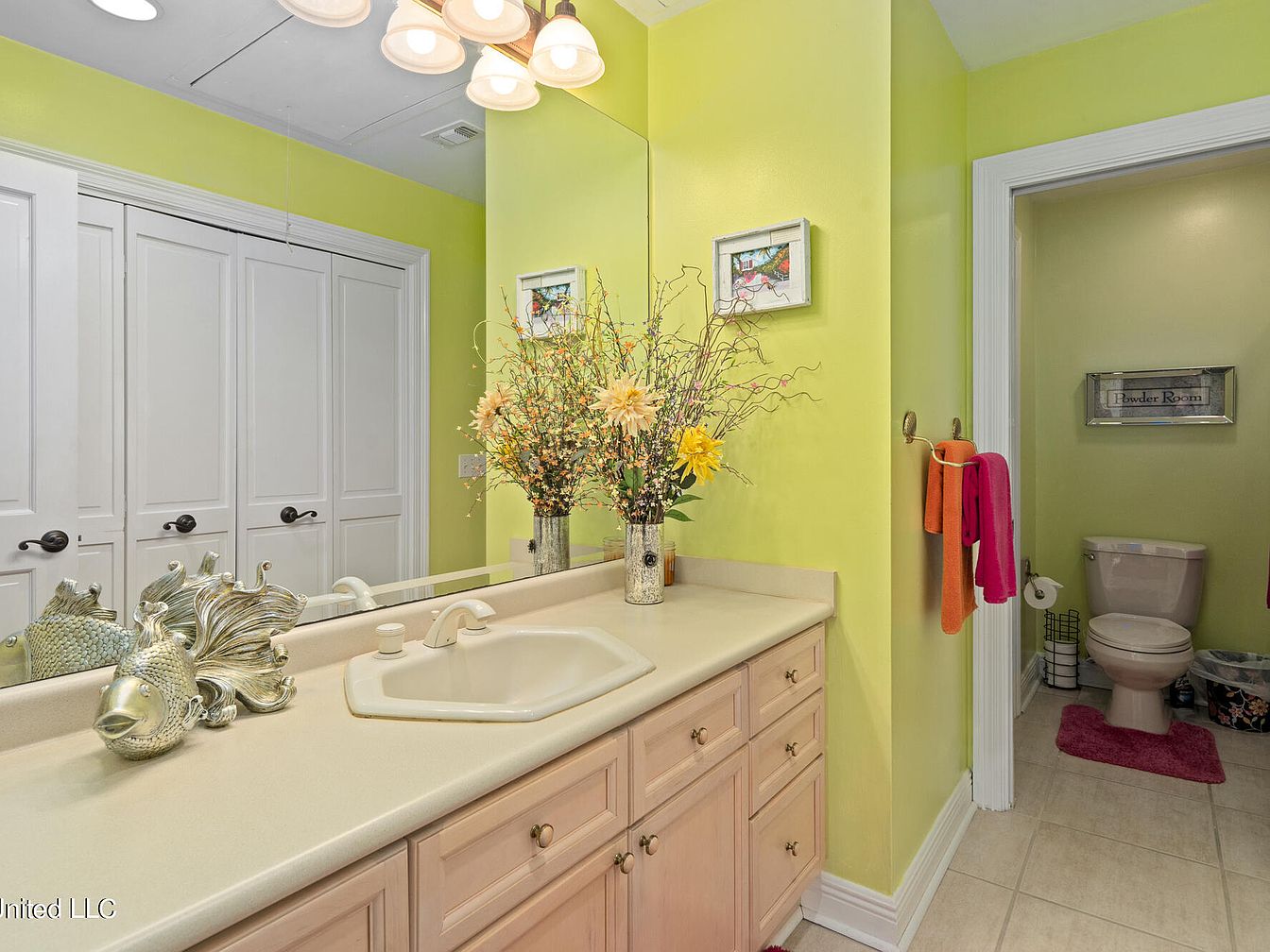 This powder room features a bright and lively lime green wall color that creates an energetic ambiance. The large mirror above the beige countertop enhances the sense of space, reflecting light and the floral arrangement placed in a rustic vase, adding a natural touch. The vanity has light wood cabinetry with traditional round knobs for ample storage. On the countertop, a decorative fish sculpture adds personality. Adjacent to the vanity, an entryway leads to the toilet area with a “Powder Room” sign, soft pink and orange towels on a bronze towel bar, and a pink bath mat on the tiled floor.