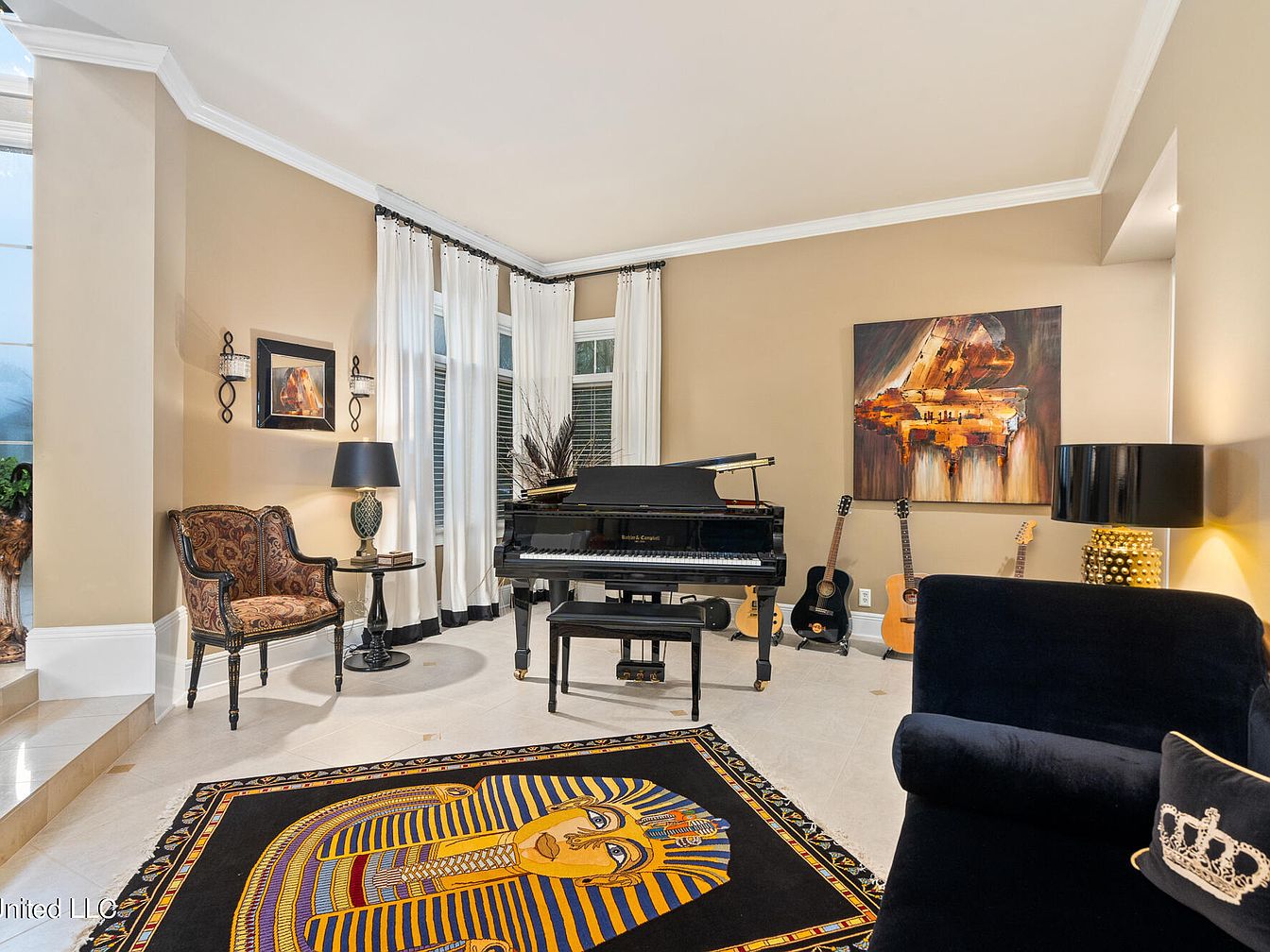 This elegant music room features a glossy black grand piano as the centerpiece, complemented by three acoustic guitars arranged against a warm beige wall. Natural light filters through tall windows draped with white curtains, brightening the space. A patterned armchair with intricate upholstery and a round black side table with a lamp create a cozy corner for relaxation or listening. The floor showcases a bold rug with vibrant Egyptian-style artwork that contrasts beautifully with the neutral tile. Modern art on the wall and a plush dark armchair add contemporary touches, blending classic and modern aesthetics in a harmonious setting.
