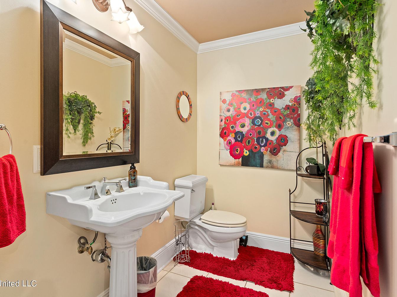 This charming guest bathroom features a classic pedestal sink with vintage-style chrome faucets beneath a large dark wooden framed mirror that adds warmth to the space. The walls are painted a soft beige, creating a neutral backdrop enhanced by vibrant red accents throughout—plush red bath rugs, matching hand towels, and a colorful floral painting dominated by bold reds and pinks. A small black metal and wood shelving unit sits beside the toilet, adorned with decorative items and greenery that cascades from above, adding a refreshing natural touch. White tiled floors and crown molding complete this inviting and cohesive look.