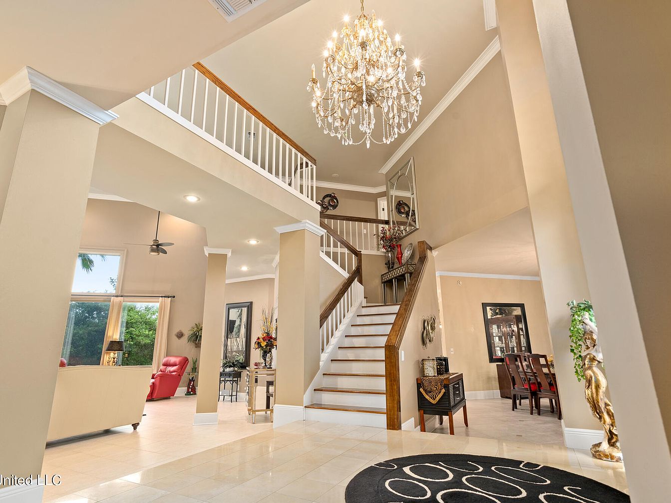 This entryway presents a spacious and inviting foyer with polished cream-colored tile flooring that enhances natural light. The two-story ceiling adds grandeur, emphasized by a sparkling crystal chandelier centered over a circular black rug with white abstract swirls. A staircase with white risers and wooden treads ascends to a second-floor balcony with white balusters and a wooden handrail. Neutral beige walls provide warmth and connect the open spaces, while decorative accents include a small console table by the stairs and floral arrangements that add color and charm. The layout flows elegantly into adjacent living and dining areas.