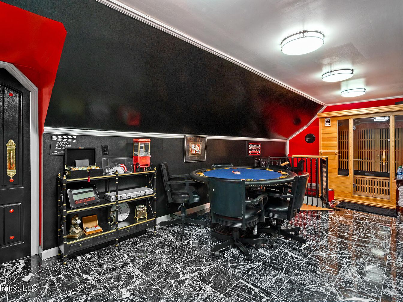 This game room features a sleek, modern design with dramatic black walls contrasted by vibrant red accents around the door and ceiling edges. The black marble floor with white veining adds an elegant, high-end touch. A round poker table with a deep blue top is surrounded by comfortable, black cushioned chairs on wheels, ideal for social gatherings or games. A black and gold shelving unit holds various gaming accessories and décor items, enhancing the room’s entertainment vibe. In the corner, a wooden sauna with glass doors introduces a relaxing amenity, combining leisure and wellness in one stylish space. Ceiling-mounted lights offer bright, even illumination, while the sloped ceiling adds architectural interest.