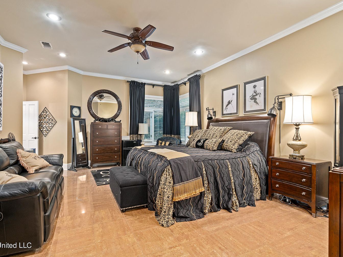This master bedroom exudes a warm, classic ambiance with beige walls complemented by white crown molding and ceiling trim. A rich wood sleigh bed dressed in an elegant black and gold patterned comforter anchors the space, flanked by dark wood nightstands with traditional lamps. Above the bed hang two monochrome artistic prints adding a touch of sophistication. The room features a plush black storage bench at the foot of the bed and a leather couch adorned with decorative pillows for added comfort. Dark curtains frame the window bay, while a tall wood dresser and a large round mirror provide balance and functionality. The ceiling fan with wooden blades and tiled flooring complete the polished look.