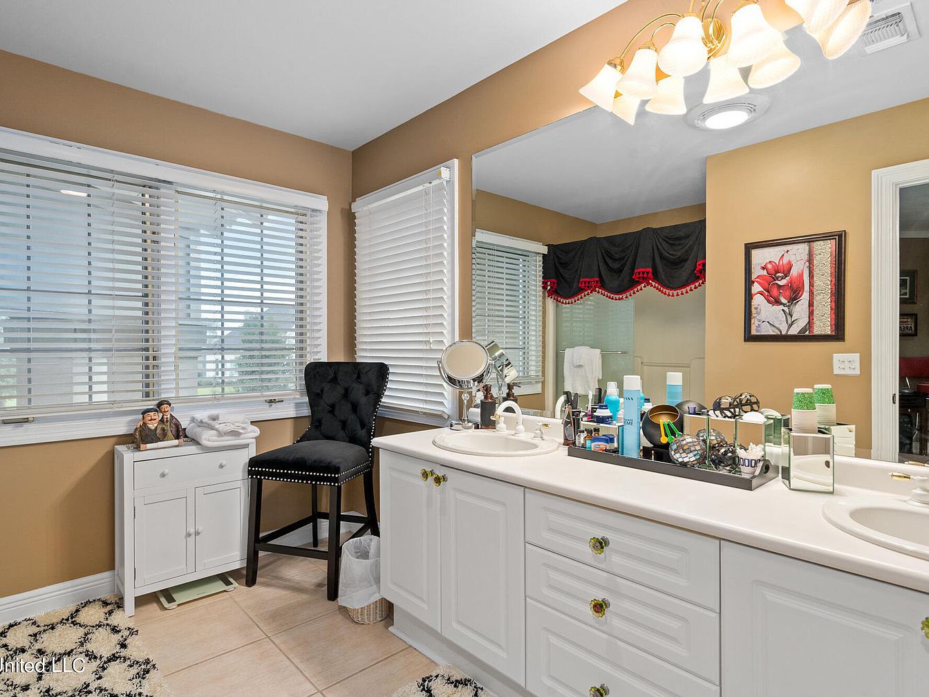 This bathroom features a bright dual-sink vanity with clean white cabinetry and multiple drawers, complemented by decorative knobs. The countertop is cluttered with various personal care products, reflecting everyday practicality. Beige walls and matching ceramic floor tiles create a warm, inviting atmosphere. Two large windows with white blinds allow natural light to flood in, enhancing the space’s openness. A plush black upholstered chair with nailhead trim adds a touch of elegance, positioned beside a small white cabinet holding folded towels and figurines. Overhead, a light fixture with multiple frosted glass shades provides ample illumination, while a striking black and red valance adorns the mirror, enhancing the room’s distinctive character.