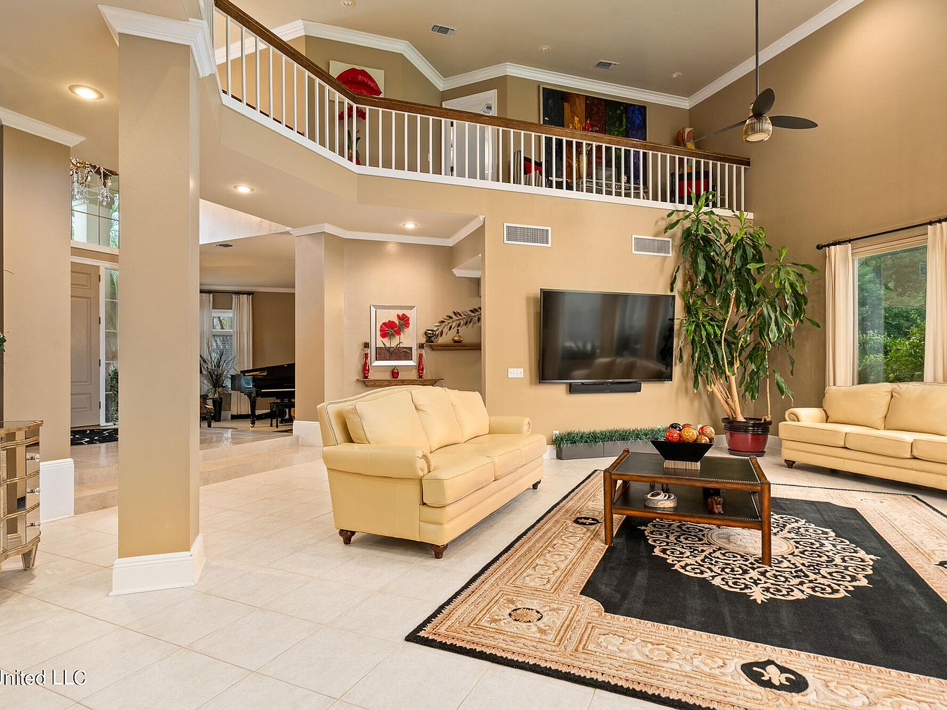 This spacious living room features a warm beige color palette on the walls, complementing the light cream leather sofas that provide comfortable seating. The high ceiling adds an airy feel, enhanced by a modern black ceiling fan. A large, ornate area rug with beige and black tones anchors the seating area, along with a sleek wooden coffee table displaying decorative accents. The mounted flat-screen TV is centered on the wall, flanked by a tall indoor plant adding greenery. The open-plan layout leads to adjacent spaces, with a white railing balcony overlooking the room, contributing architectural interest and openness.