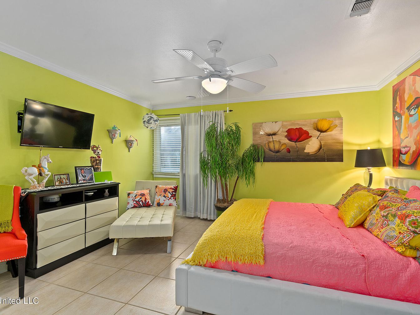This bedroom invites energy with lime green walls contrasting against a bright pink quilted bedspread and a mustard yellow throw. Patterned pillows add layers of color and texture on the white modern bed frame. Art plays a significant role, with two bold, colorful paintings contributing to the room’s lively vibe. A white tufted chaise lounge near the window provides a cozy reading nook, complemented by two floral accent pillows. The black and beige dresser beneath a wall-mounted flat-screen TV balances the room with sleek, functional storage. Ceramic sconces and potted greenery soften the space, while beige tile flooring and white crown molding add structural neatness. A ceiling fan with a built-in light fixture hangs centrally, providing both airflow and ambient lighting.