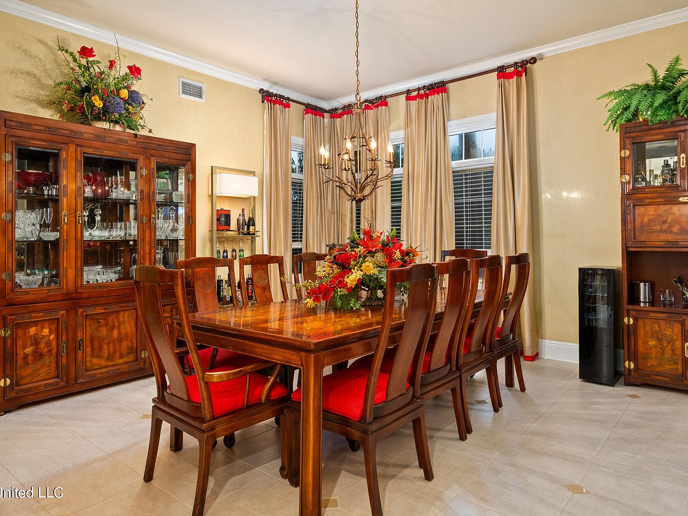 This formal dining room features a large wooden dining table with seating for ten, showcased with rich reddish-brown wood and vibrant red upholstered cushions on the chairs. Surrounding the space are traditional wooden display cabinets filled with glassware and decor, accentuating the classic and elegant ambiance. Cream-colored walls and matching long drapes with red accents complement the warm wood tones while allowing natural light to softly filter through the tall windows. A wrought iron chandelier hangs centrally, adding rustic charm and soft illumination. The neutral tiled floor balances the room’s warm and inviting yet sophisticated aesthetic.