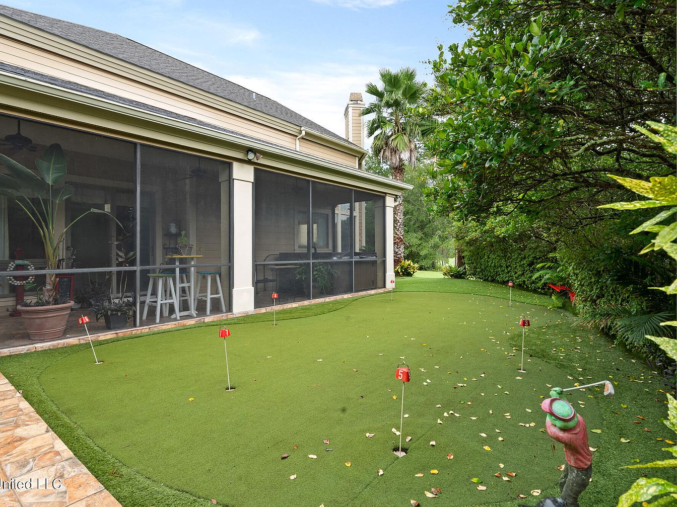 This backyard space features a well-maintained artificial putting green equipped with multiple small flags marking individual holes, enhancing recreational appeal. The putting green is bordered by lush shrubbery and tall trees, creating a private, natural environment. Adjacent to the green is a screened porch with light-colored wooden columns and a subtle beige exterior, providing an inviting transition between indoor and outdoor spaces. Inside the porch, high stools and indoor plants add a touch of comfort and greenery, contributing to a relaxed, casual atmosphere perfect for entertaining or enjoying leisure time outdoors.
