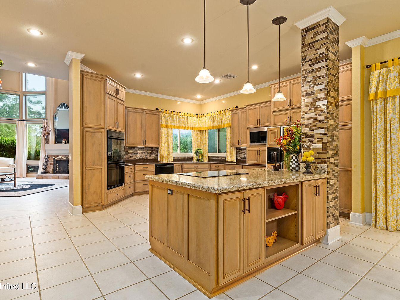This spacious kitchen centers around a large island with a polished granite countertop, offering both preparation space and a sleek cooktop. The light wood cabinetry, with a natural finish, complements the warm yellow walls and is paired with dark handles for contrast. A tiled column with mosaic patterns adds a focal architectural feature, matching the kitchen’s backsplash. Pendant lights hang above the island, providing focused lighting. The windowed corner is framed with cheerful yellow and white curtains that brighten the room, while the tiled floor in a soft cream hue balances the warm tones and ties the space together elegantly. The kitchen opens to a living room with high ceilings and a fireplace, enhancing the open-concept design.