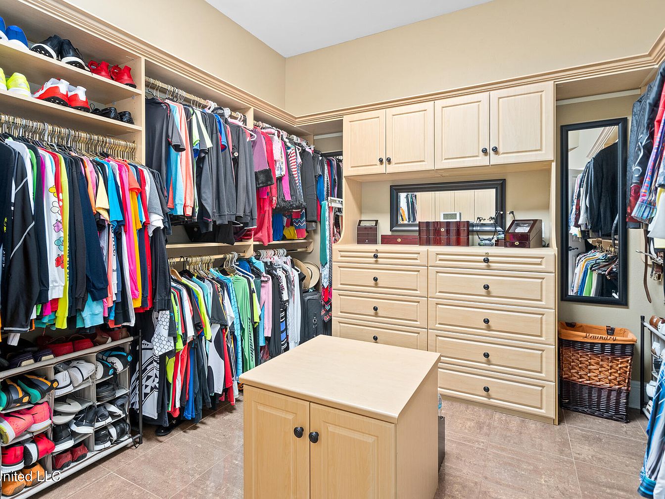 This spacious walk-in closet features a clean and organized layout, with light wood cabinetry and ample storage. Double hanging rods line two walls, accommodating a variety of colorful clothing items, from casual wear to jackets. The built-in dresser with nine drawers sits beneath matching upper cabinets, providing concealed storage space. A large mirror framed in dark trim is mounted above the dresser, complemented by a full-length mirror on the adjacent wall. The center island offers additional storage with cabinet doors, while shoe racks beneath the clothing rods keep footwear neatly arranged. Soft beige walls and polished tile floors complete the look, creating an inviting and functional dressing space.