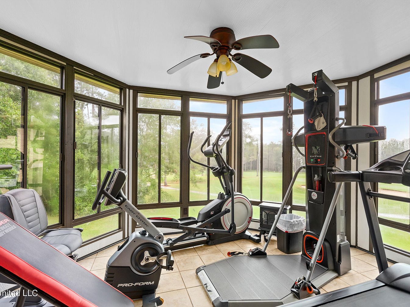 This workout nook features large wrap-around windows that flood the space with natural light and offer expansive views of lush greenery outside. The neutral tiled flooring complements the subdued tones of the exercise equipment, which includes a stationary bike, elliptical, and a multi-function trainer, emphasizing functionality. The ceiling fan with dark blades and warm-toned light fixtures adds a classic touch while providing comfort during workouts. Framed by dark window casings, the room blends indoor fitness with the peaceful outdoor scenery, creating an inviting setting for staying active indoors with a serene backdrop.