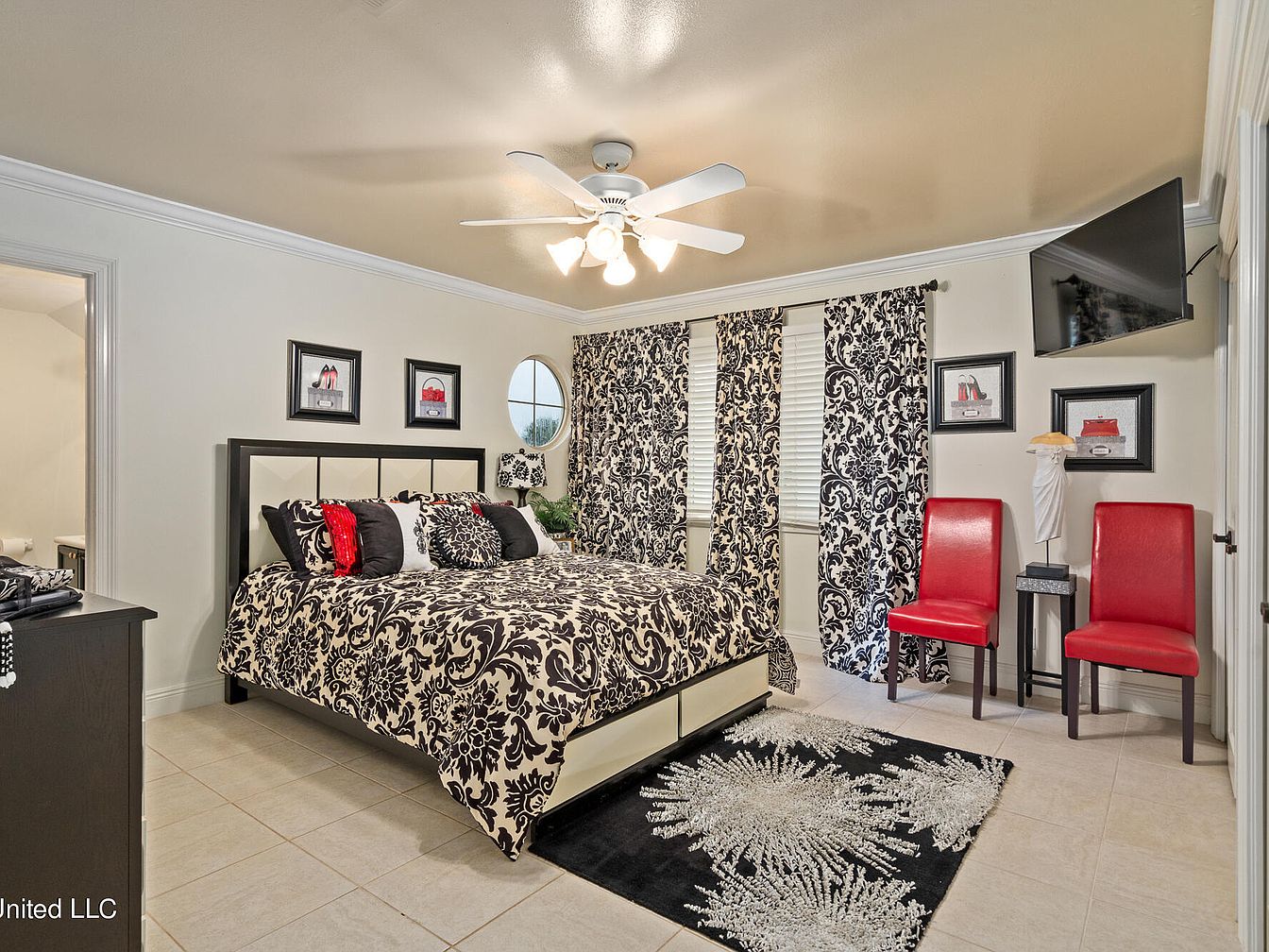 This master bedroom blends classic elegance with modern comfort through its carefully coordinated color scheme and furnishings. The predominantly black and beige décor features a stylish bedspread with intricate black floral patterns that harmonize with matching drapes. Accents of bold red appear in the two sleek chairs and selective pillows, creating a striking contrast. The room includes a ceiling fan with multiple lights for optimal illumination. A small, contemporary black rug printed with abstract white designs sits at the foot of the bed. Decorative framed pictures and a modern sculpture on a pedestal add a refined touch, enhancing the room’s sophisticated appeal.