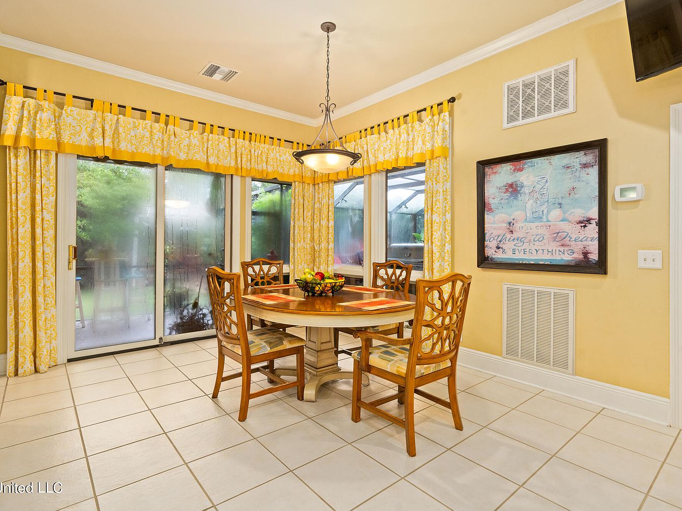 This cozy breakfast nook features a round wooden table with a cream-toned pedestal base surrounded by four matching chairs with decorative backs and cushioned seats patterned in soft tones. The walls are painted a warm yellow, creating a cheerful ambiance complemented by floor-to-ceiling windows draped with yellow and white damask-patterned curtains and coordinating valances. Natural light filters through fogged glass panes, enhancing the intimate setting. A stylish pendant light with a frosted glass shade hangs overhead. On one wall, a framed colorful artwork adds a touch of artistry, while the tiled floor provides an easy-to-clean surface, perfect for casual dining.