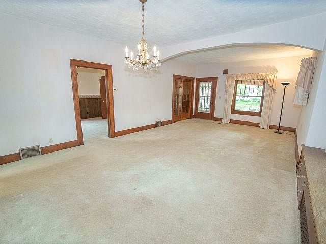 This generous living room extends under a smooth, slightly textured white ceiling, featuring a central chandelier with classic crystal details providing subtle elegance. The pale, neutral carpet softens the space, blending seamlessly with white walls and warm wood trim around door frames, baseboards, and window casing. A wide arch gracefully divides the room, enhancing an open floor plan feel. Multiple doorways lead to adjacent rooms, including a space with wood-paneled walls. A large window dressed with light curtains allows natural light and views of greenery outside, while a tall floor lamp brightens a quiet corner near the entrance door with glass paneling.