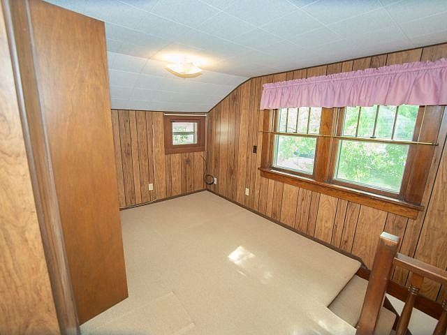 This compact upper-level room features rich wood-paneled walls that create a warm, vintage atmosphere. The flooring is covered in light beige carpet, complementing the wood tones and enhancing the cozy feel. A small square window on one wall brings in natural light, while a larger double window with a pink valance offers a view of lush greenery outside. The ceiling is flat and painted white, contrasting softly with the darker wood. The stairway railing visible on the right suggests this space could serve as a quiet nook, small office, or reading room within the home’s layout.
