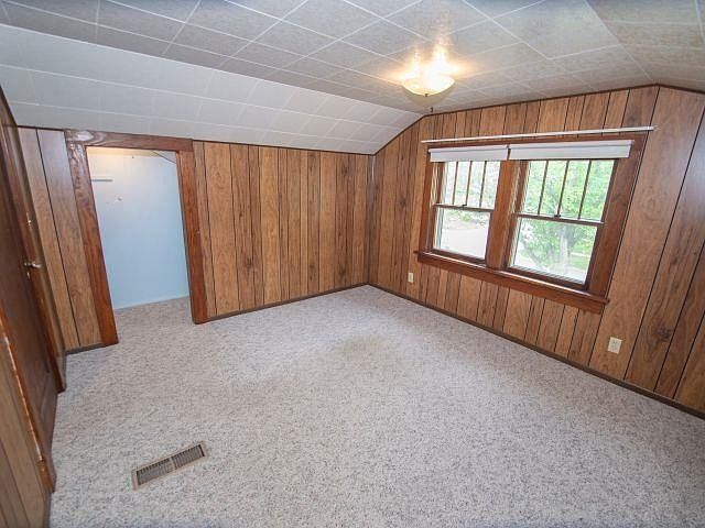 This inviting bedroom features wood-paneled walls that lend a warm, rustic ambiance. The neutral-toned carpeting complements the wood trim around the double windows, which allow natural light to brighten the cozy interior. The ceiling is designed with a soft, off-white tile pattern, adding subtle texture. A simple, flush-mounted ceiling light provides even illumination. The room has a small alcove or inset space that could serve as a closet or storage area, maintaining an uncluttered and functional layout. Overall, this bedroom offers a blend of traditional elements and understated comfort.