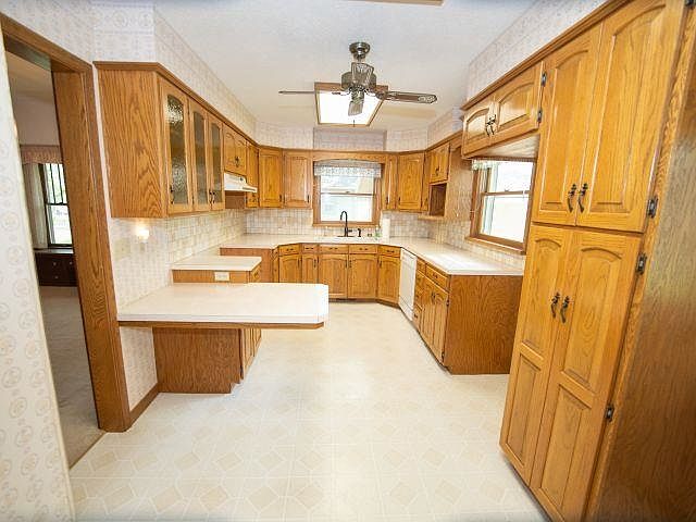 This kitchen features a traditional U-shaped layout with warm oak cabinetry that extends fully around the working space, maximizing storage and functionality. White countertops and backsplash tiles maintain a clean, bright contrast against the honey-toned wood. Two windows above the sink area provide natural light, enhancing an inviting atmosphere. The built-in peninsula offers additional workspace and casual seating opportunity. A ceiling fan with a light fixture centrally placed ensures airflow and illumination. The flooring is covered in off-white vinyl with subtle geometric patterns, complementing the overall vintage charm of this well-maintained kitchen.