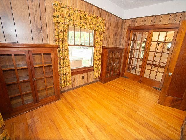 This cozy space features warm, honey-toned hardwood floors that complement the rich wood paneling covering the walls, creating a vintage, inviting atmosphere. Two built-in glass-front cabinets flank a large window dressed with cheerful yellow curtains patterned with floral and geometric motifs, enhancing the room’s retro charm. Beyond the room, elegant wooden French doors with multiple glass panes add architectural interest and allow natural light to flow between adjoining rooms. The combination of natural wood finishes and bright curtains gives this intimate nook a quaint, nostalgic feel, perfect for quiet reading or relaxation.