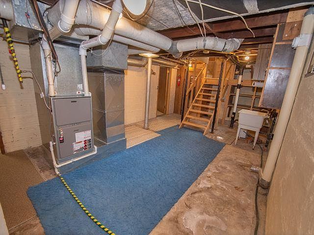 This basement area serves primarily as a utility space, featuring exposed piping and ductwork running along the ceiling. The flooring varies, combining a rough concrete surface alongside a strip of blue carpet that defines a walkway or functional zone. Wooden stairs lead to the upper level, enhancing the utilitarian design. The walls are finished with a mix of painted brick and wood paneling, lending an industrial vibe. A utility sink and cabinet offer practical storage and convenience. Overall, this space balances functionality and basic upkeep, ideal for home systems, laundry, or storage purposes.