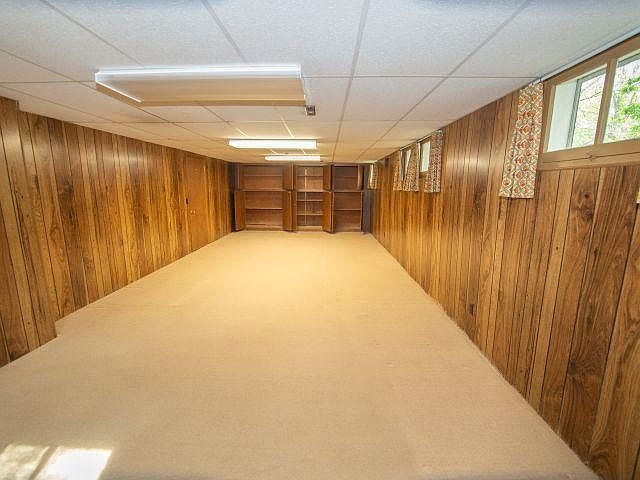 This long, narrow basement recreation room features dark wood-paneled walls that give the space a retro, cozy feeling. Beige carpeting covers the floor, complementing the warm tones of the wood paneling. A row of small, rectangular windows near the ceiling allows natural light to filter in, enhanced by decorative curtains adding a subtle vintage touch. Fluorescent ceiling lights provide ample illumination. At the far end, built-in wood shelving units offer practical storage and display options. The room’s simple layout and earthy colors present a functional, nostalgic space ready for personalized use.