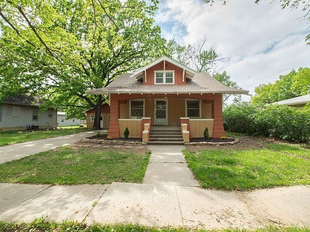 This charming home in Hillsboro, KS, embodies a classic Craftsman architectural style with its inviting front porch, wide eaves, and exposed rafter tails. The well-maintained property features a porch perfect for relaxing at the end of the day and a backyard patio ideal for watching sunsets. Inside, the house offers hardwood floors, notably in the library, and a spacious living room that seamlessly connects to the large dining room, promoting an open and airy feel. The main floor includes one bedroom and a bathroom, while upstairs houses three additional bedrooms and another bathroom, providing comfortable living space for families. Additional amenities include a one-car garage with an insulated workroom and extra storage for lawn equipment, alongside a secondary garage suited for smaller cars or additional storage. The basement boasts generous storage options, including large door cabinets behind the family room to store games or cherished mementos. Conveniently located just two blocks from local schools and downtown Hillsboro, this home combines practicality with a prime location. The property is listed at $169,000, offering a fantastic opportunity to own a spacious, well-appointed home near community amenities.