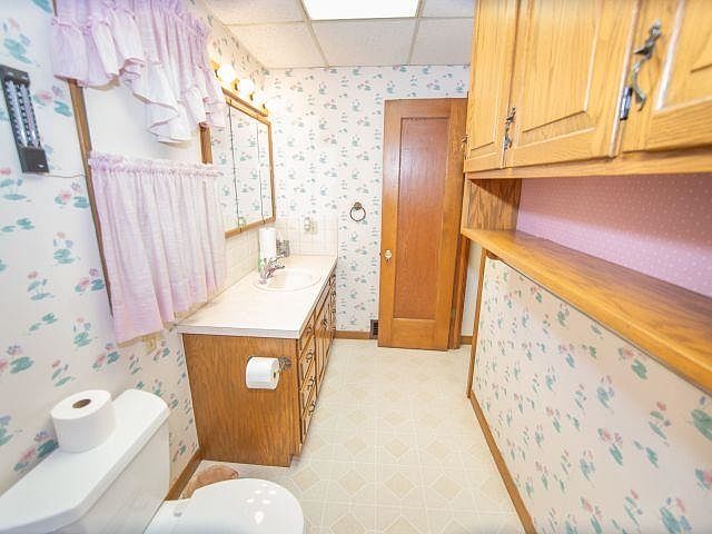 This bathroom features a classic vintage style with floral wallpaper in soft pastel shades of blue and pink throughout the walls, paired with light beige vinyl flooring with subtle geometric patterning. The vanity has a wooden cabinet base with ample storage, topped by a white countertop and a built-in sink. Above the sink, a framed mirror with wall-mounted lighting fixtures gives the area a cozy feel. Pink, ruffled, semi-sheer curtains soften the light from a small window above the toilet. On the opposite side, a long wood shelf below matching cabinets adds additional storage and decorative space, enhancing the warm, homey atmosphere.