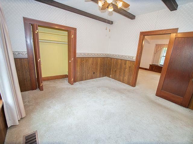 This cozy bedroom corner features a blend of vintage and rustic elements. The lower half of the walls is covered in rich, dark wood paneling with a classic wallpaper above that adds a subtle textured pattern. Two wooden doors lead to a spacious closet and an adjoining room, both framed with matching dark wood trim creating a warm contrast against the lighter carpet flooring. Exposed ceiling beams reinforce the rustic feel, while a ceiling fan with wooden blades and multiple light bulbs provides both illumination and ventilation. Soft natural light filters in through a curtained window, contributing to the room’s inviting ambiance.