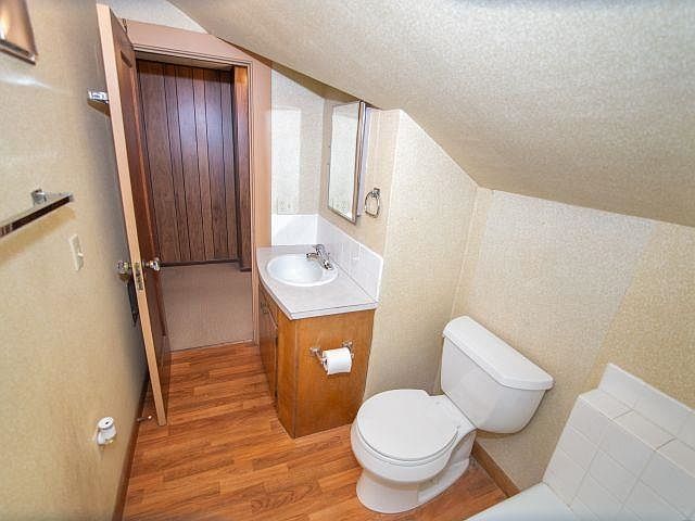 This small bathroom features a practical layout making efficient use of space under a sloping ceiling. The flooring is a warm wood-tone laminate that contrasts with the off-white walls and cabinetry. A white toilet sits adjacent to a vanity cabinet with a simple white countertop and built-in sink. Above the sink, a rectangular mirror is mounted on the wall, flanked by a metal towel ring. The door, finished in a medium wood tone, leads out to a room with wood paneling, enhancing the subtle rustic vibe and comfort-focused atmosphere.