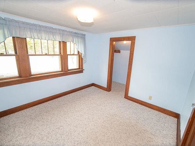 This quaint bedroom corner features soft blue walls complemented by warm wood trim around the windows, doorway, and baseboard, creating a cozy, inviting atmosphere. The large triple window allows natural light to softly filter in, brightening the space and accentuating the textured beige carpet that covers the floor. A small alcove or closet space is accessed through the wood-framed doorway, adding functional storage while maintaining simplicity in design. The ceiling light fixture is modest, ensuring the room remains well-lit without overwhelming the calm, serene vibe of this intimate bedroom nook.