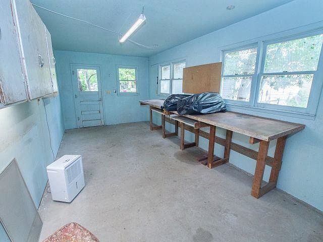 This utility room presents a functional workspace featuring a durable wooden bench that runs along one wall, suitable for projects or storage. The concrete floor and simple, pale blue walls create a practical, industrial feel. Multiple windows line the right wall, filling the space with natural light and offering a view of the outdoors. The back wall includes a door with a window pane, providing access and additional light. A compact dehumidifier sits on the floor, suggesting climate control for the room. Ceiling-mounted fluorescent lighting ensures the space is well-lit for detailed tasks. Basic cabinetry adds storage options, completing the utilitarian design.
