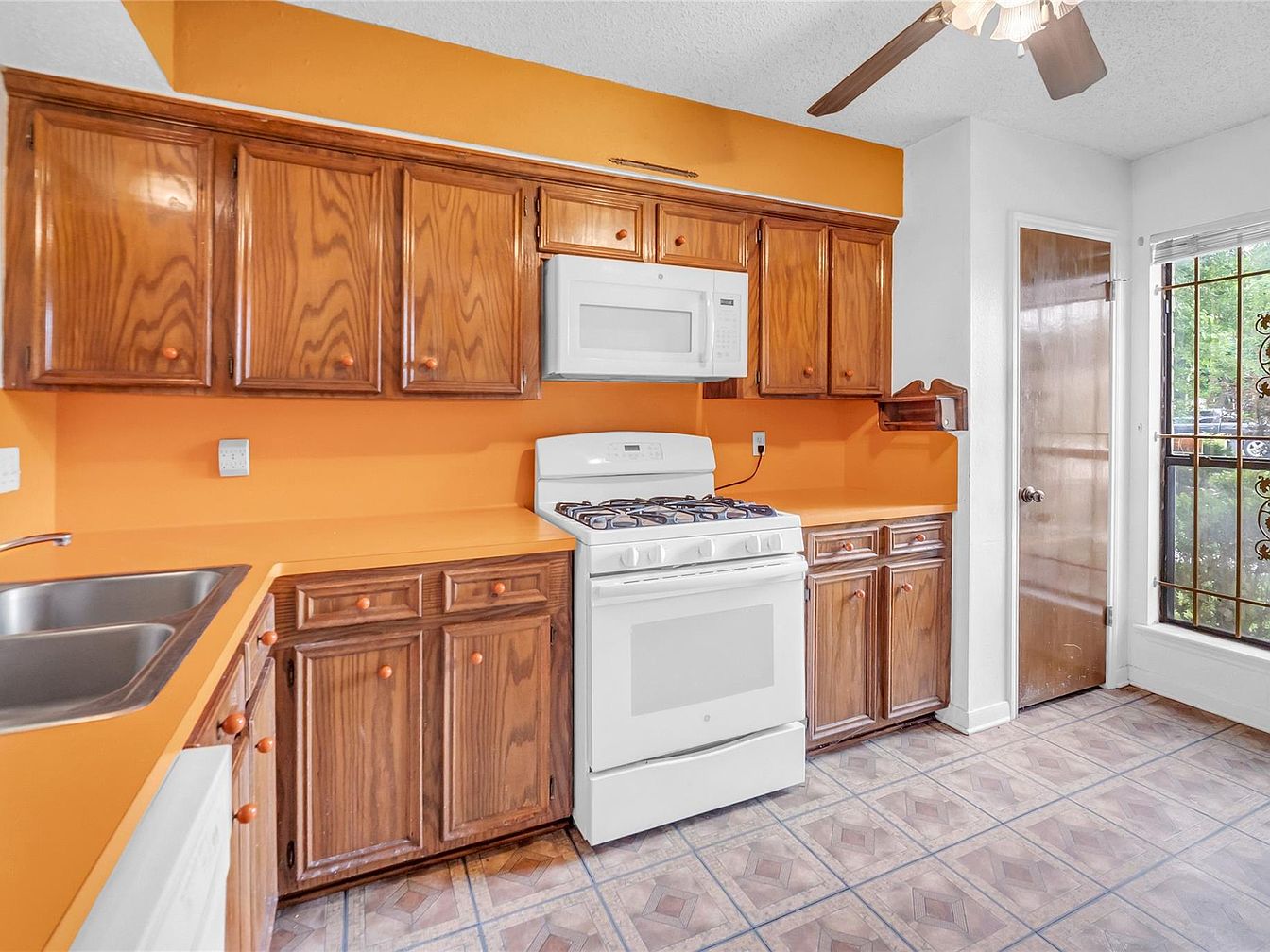 This kitchen features a warm and inviting layout with wood cabinetry that highlights natural grain patterns and orange knobs, paired with matching orange countertops and backsplash that brighten the space. A white gas stove and microwave provide a clean contrast against the vibrant color scheme. The double stainless steel sink sits adjacent to the stove, facilitating meal prep and cleanup. The flooring consists of patterned tiles in muted neutral tones, complementing the bright walls. A ceiling fan hangs overhead, ensuring ventilation, while a door next to a large window with decorative ironwork offers natural light and access to the outside.
