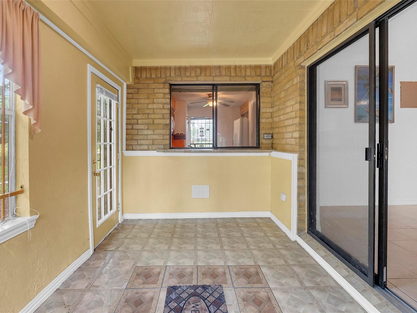 This cozy sunroom features warm, buttery yellow walls complemented by a soft pink valance over the window, enhancing a welcoming atmosphere. The floor is covered in large, light-colored, square tiles with an elegant patterned insert in the center, adding subtle charm. To the right, a sliding glass door framed in black opens into the home’s main living area, allowing natural light to flow through. A unique half-wall with exposed brick lines the back, topped by a black-framed window offering a peek into the kitchen, blending rustic and contemporary design with functional openness.