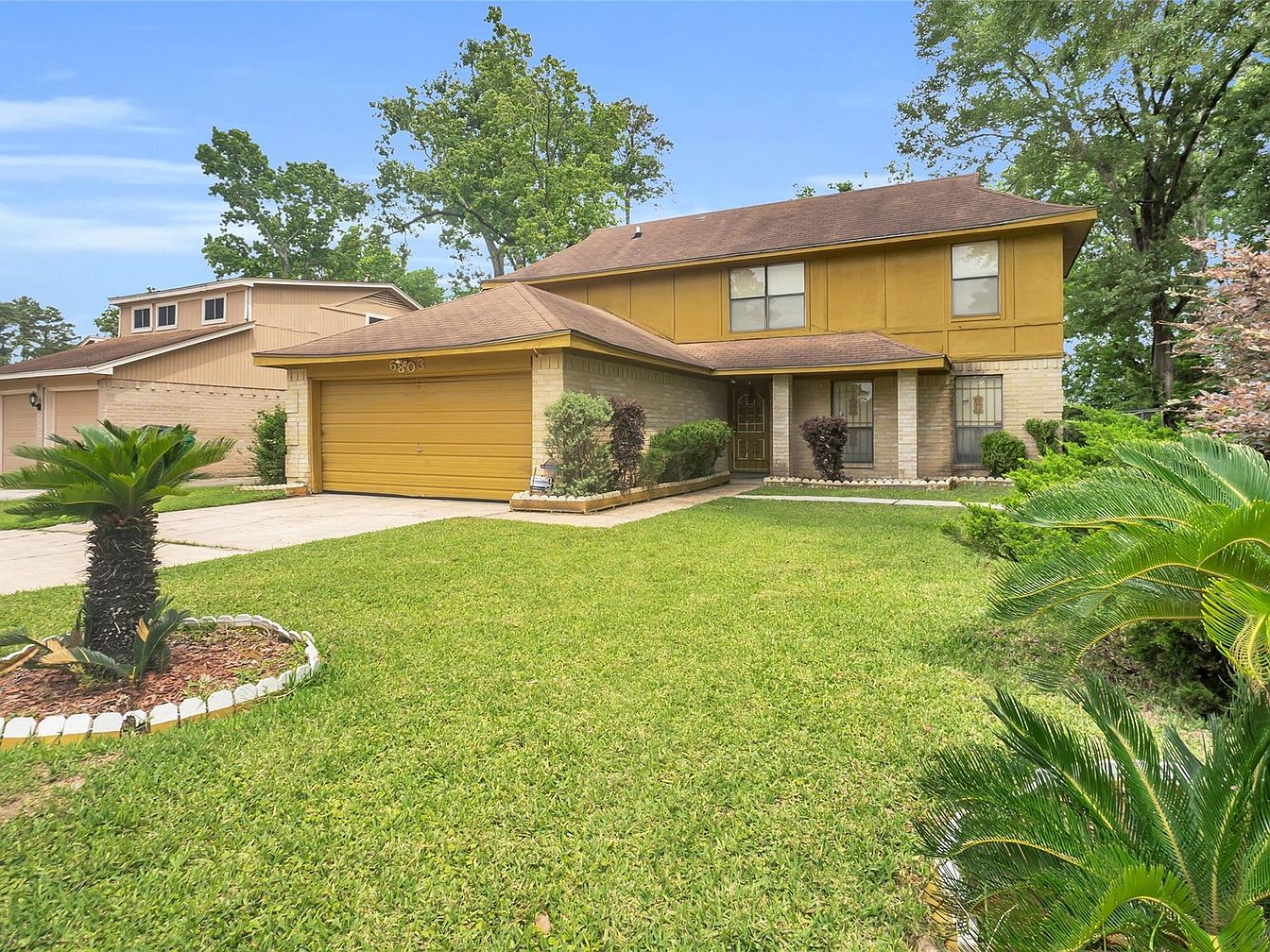 This spacious two-story home in Houston, TX, features a functional layout with 3 bedrooms and 3.5 bathrooms, ideal for comfortable family living. The architectural styling leans towards a mid-20th-century traditional design, characterized by its simple roofline, brick and wood-paneled exterior, and integrated 2-car garage. Although the exact year of construction is not listed, the style suggests it may have been built in the late 20th century. The primary bedroom is conveniently located on the first floor, accompanied by a formal dining room, family room, and a versatile game room, providing ample space for both everyday living and entertaining. Outside, the property boasts a generously sized backyard with lush green lawn, a storage shed, and a separate exterior structure that offers potential for conversion into a guest suite, home office, or rental unit, perfect for multigenerational living or additional income. The home is listed at $299,900, presenting a fantastic opportunity for buyers looking for a versatile and promising residence in Houston.