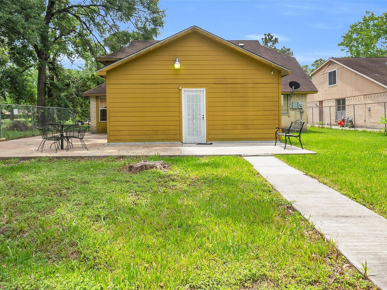 This backyard space features a mustard-yellow exterior wall with horizontal siding and a centrally placed white metal door, inviting access to the home. A simple concrete pathway leads through the well-maintained green lawn directly to the door. To the left, a concrete patio area hosts an elegant black metal table and chairs, ideal for outdoor dining or relaxation. On the right side, a matching black bench provides additional seating. Mature trees beyond the fenced yard create a natural, serene backdrop, while the overall layout emphasizes a blend of functionality and casual outdoor living.
