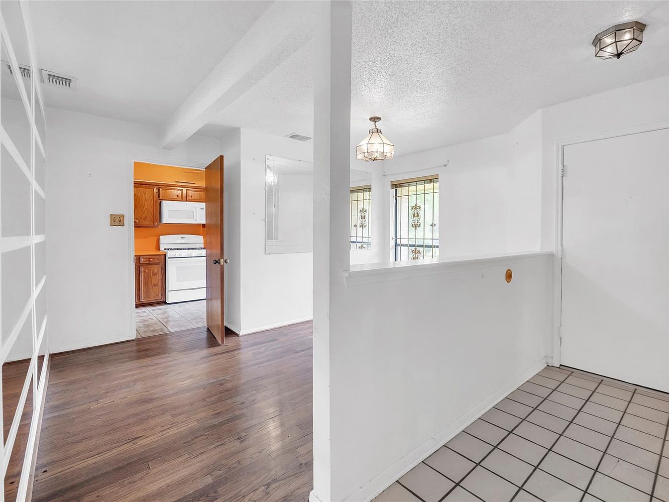 This space features an entryway with white tiled flooring and white walls, creating a clean and bright atmosphere. To the left, dark wood laminate flooring extends into the adjacent area, providing warmth and contrast. A half wall separates the entryway from the living space, topped by a distinctive geometric chandelier that adds subtle visual interest. Beyond, an open doorway leads to a compact kitchen with vibrant orange walls, natural wood cabinetry, a white microwave, and stove. The combination of colors and materials highlights a mix of clean modern and vintage elements.