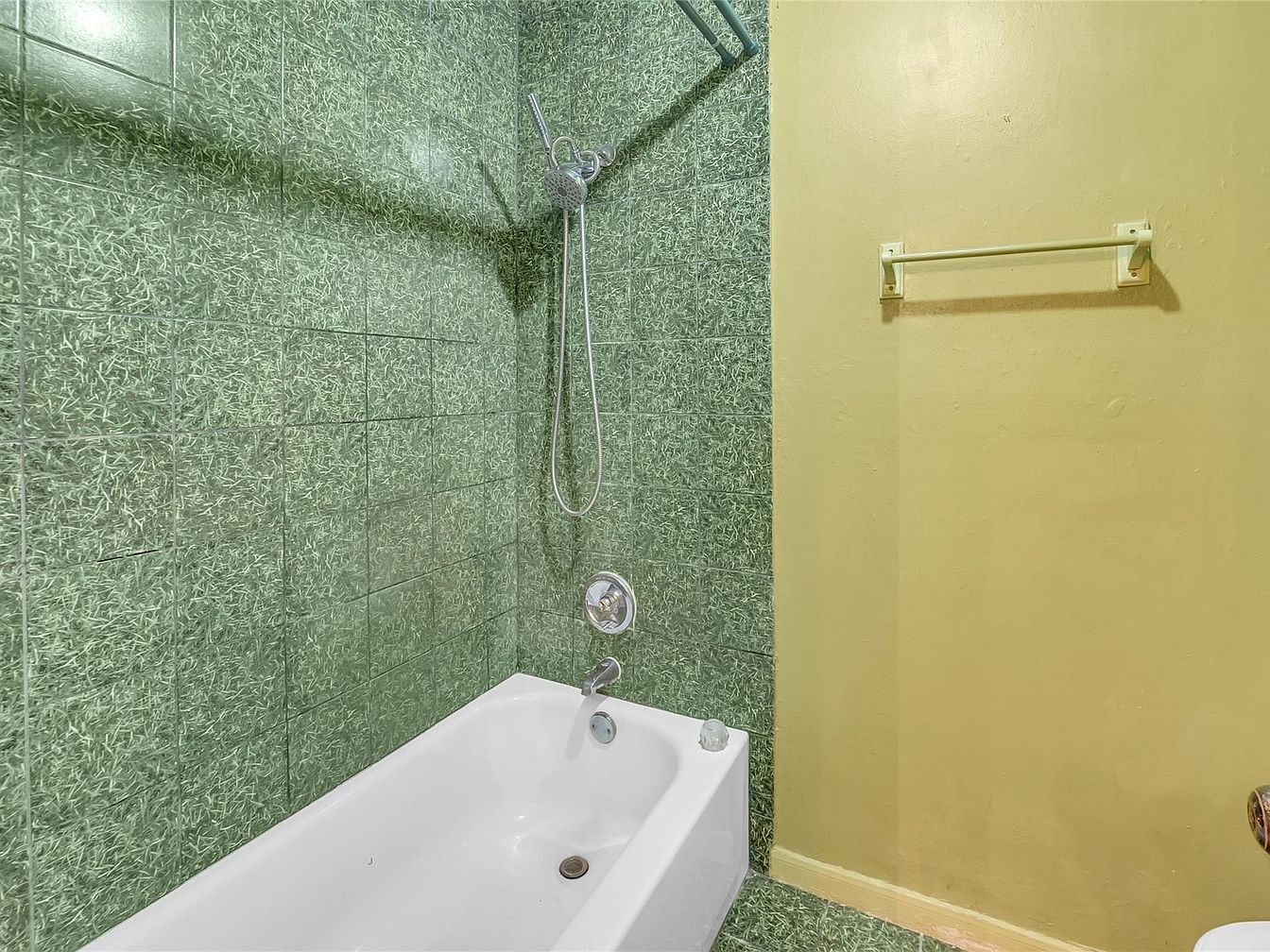 This bathroom section presents a compact shower and bathtub combo, characterized by a distinct green tile pattern that covers the shower walls and extends partially onto the floor. The tiles feature a textured, grass-like design, adding an earthy and retro vibe to the space. The bathtub is white and simple, contrasting with the vibrant tile. A modern silver showerhead with an attached handheld sprayer is mounted above, alongside a circular control knob below. The adjacent wall is painted in a muted yellow tone and equipped with a white towel rack, complementing the overall vintage aesthetic.