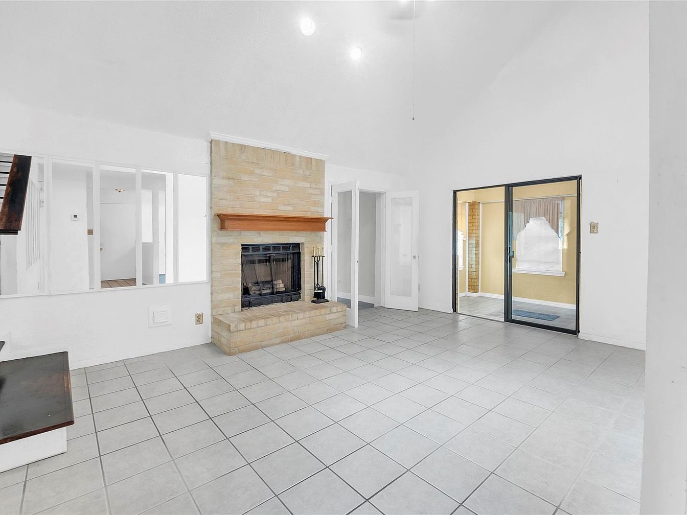This living room features a high ceiling that enhances the spacious and open ambiance. Light gray tiled flooring runs throughout, complementing the white walls that keep the space bright and airy. The focal point is a centered fireplace set in a beige brick surround with a wooden mantel, adding warmth and a natural touch. Adjacent glass doors offer access to an adjoining room flooded with natural light, highlighted by soft yellow walls and cream window treatments. White-framed interior windows and French doors contribute to an open feel, blending classic and contemporary elements seamlessly.