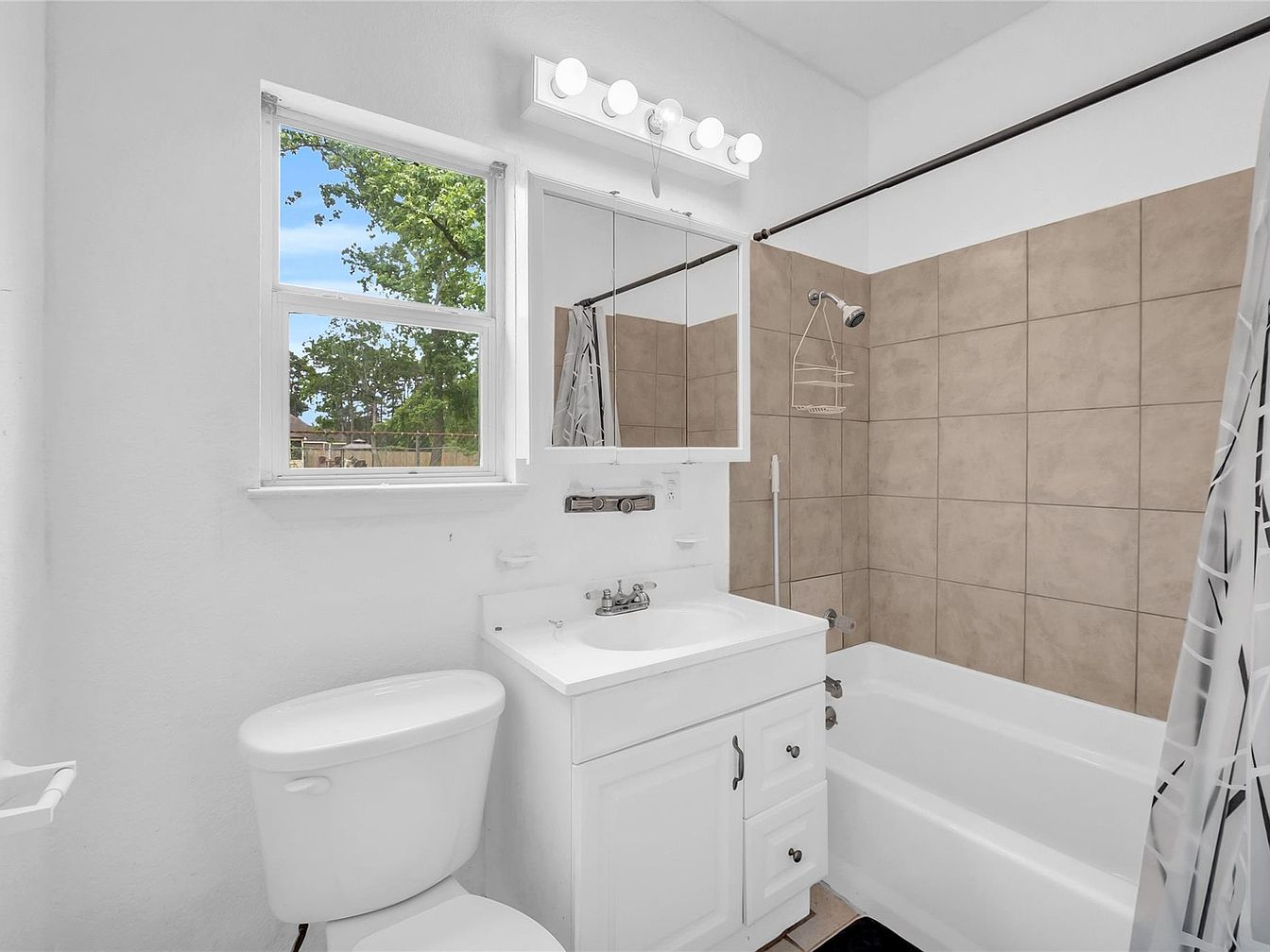 This compact bathroom features a clean and bright design with white walls and fixtures. The space includes a white toilet positioned under a double-pane window that allows natural light to stream in, creating an airy atmosphere. Adjacent is a white vanity with a built-in sink, accompanied by a perforated mirrored medicine cabinet above. The shower and bathtub area is decorated with large beige tiles that add a warm contrast to the white theme, and a curtain with a modern abstract pattern hangs from a dark rod. A row of globe lights above the mirror completes the look, balancing functionality and simplicity.