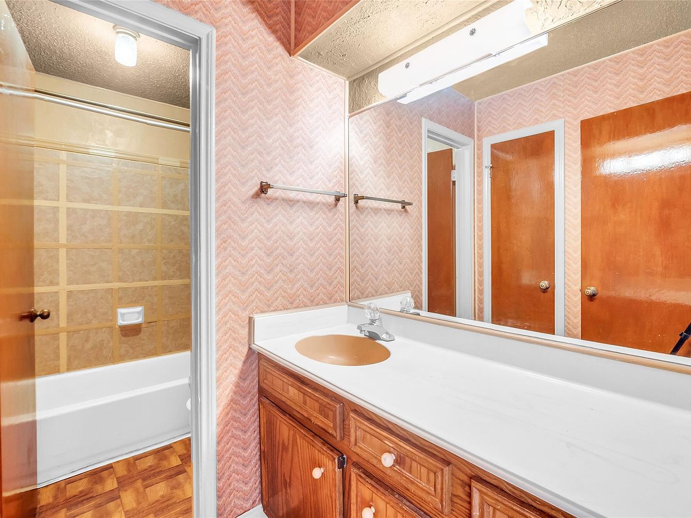 This bathroom features a retro aesthetic with pink chevron-patterned wallpaper creating a distinctive textured backdrop. The vanity has a warm wood finish with simple cabinet hardware, topped by a white countertop that contrasts with the built-in oval sink in a complementary muted beige tone. Above the vanity, a wide mirror extends the length of the counter, flanked by a basic horizontal light fixture. The bath area is separated by a doorway painted in light gray, enclosing a white bathtub with beige tiled walls accented by a grid pattern, adding subtle visual interest. The parquet flooring blends natural wood tones with the overall warm color scheme.