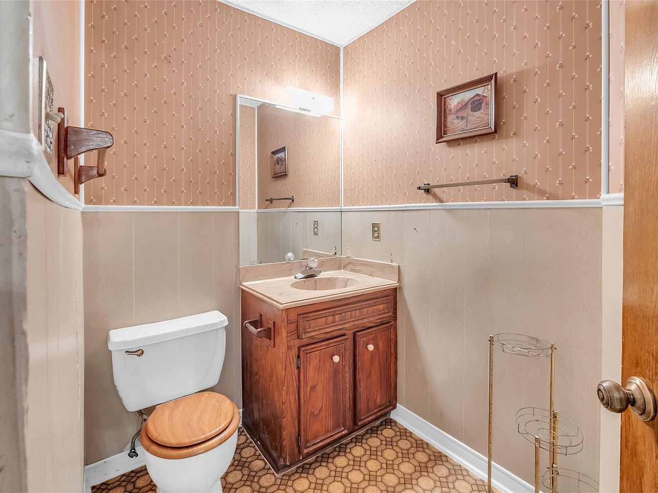 This compact half bathroom features a traditional layout with a single-sink vanity and a toilet. The vanity is made of rich wood with paneled cabinet doors and a matching wood-tone countertop and sink, complemented by a chrome faucet. Walls are adorned with a two-tone treatment: the lower half in light beige wood paneling while the upper half is covered in wallpaper with a subtle vertical floral pattern in warm tan hues. A large rectangular mirror above the vanity reflects the soft lighting from a modern horizontal fixture. The floor showcases a vintage patterned vinyl design in earthy tones, adding to the room’s retro charm. An empty brass toilet paper holder and a mounted towel bar provide functional accents, while a framed painting adds a touch of rustic character. The overall aesthetic blends nostalgic warmth with practical simplicity.
