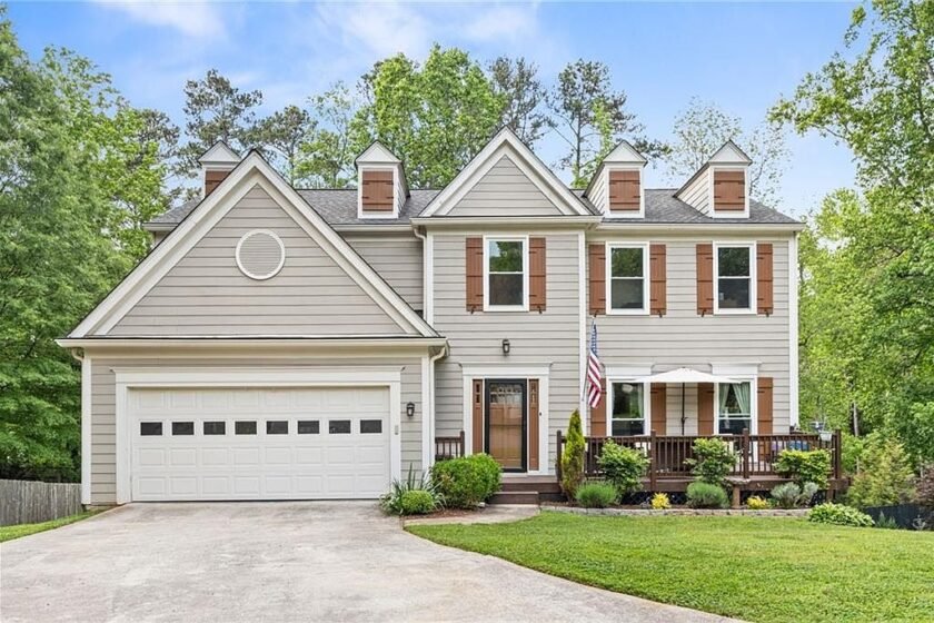 This charming home exhibits elements typical of American Traditional architectural style, featuring gabled roofs and classic wooden shutters painted in a warm brown tone that contrast beautifully with the light beige siding. Situated in the serene cul-de-sac of the Feather Sound community in Johns Creek, GA, this property combines suburban tranquility with urban convenience, being minutes from Downtown Alpharetta and walking distance to local amenities including Publix, Starbucks, and Newtown Park. Built originally in a style that suggests a mid to late 20th-century design, this residence has been beautifully updated with modern features and upgrades. Noteworthy renovations include all-new Pella windows that enhance natural light flow throughout the home, as well as a fully remodeled kitchen with white cabinetry, stone countertops, and a cozy breakfast nook that opens seamlessly to a fireside family room. The home offers four spacious bedrooms and two and a half bathrooms. The primary suite upstairs features vaulted ceilings and a luxurious ensuite with double vanities, a whirlpool tub, and separate shower. Additional highlights include a formal living room adaptable for various uses, a separate dining room, and a finished terrace level with flexible space for entertainment or additional bedrooms, including a dedicated movie room. Set on a large cul-de-sac lot, the property boasts a massive fenced backyard and an expansive back deck perfect for outdoor leisure and sunset views. The house lies within a top-rated school district, adding to its appeal for families. The listing price is $630,000, reflecting the numerous amenities and prime location this home has to offer in Johns Creek, GA.